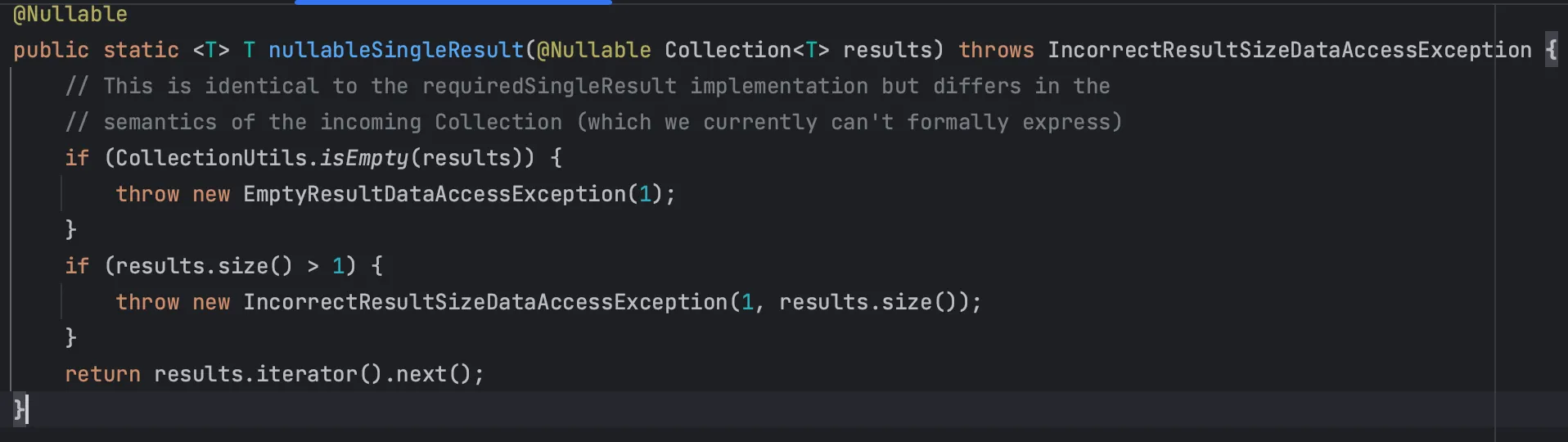 해당 경우는 DB 드라이버의 스펙과 데이터상으로 발생할 수 있는 케이스에 대해 명확하게 인지하고 있기 때문에, 서버 에러가 아닌 예외를 내부 애플리케이션 클라이언트 레벨의 예외로 핸들링 하는게 좋을 수도 있다. 대신, repository내부에서만 List인것을 알고있고 외부관점에서는 단일 엔티티로 반환한다라는것을 명확하게 한다.