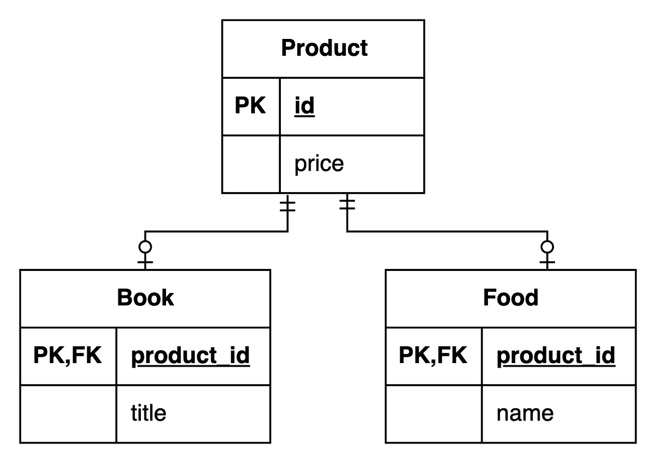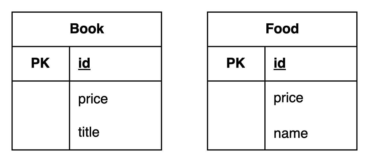 - 각 하위 클래스가 공통 속성 외에도 다양한 고유 속성을 가지고 있을 경우. 정규화된 구조를 원하거나, 데이터 중복을 피하고자 할 때 적합하다.