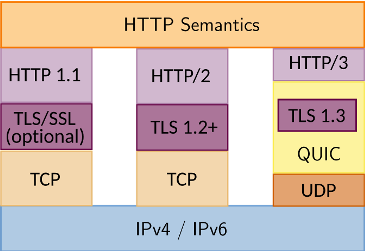 TCP 위에서 돌아가는 HTTP/2와는 달리, HTTP/3는 QUIC(Quick UDP Internet Connections)이라는 계층 위에서 돌아가며 UDP 기반으로 돌아간다. HOL Blocking 문제를 해결하는데 중점을 두고 설계되었다.