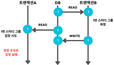 만약, 스터디 그룹 입장에 대한 여러 요청이 동시에 발생할 경우, StudyGroup 내의 최대 수용 인원을 초과하지 않도록 보장하기 어렵다.