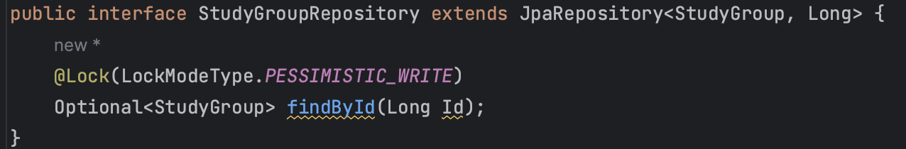 Spring Data Jpa를 사용하고 있기에, JpaRepository에서 어노테이션을 사용하여 쉽게 비관적 락을 설정할 수 있다.